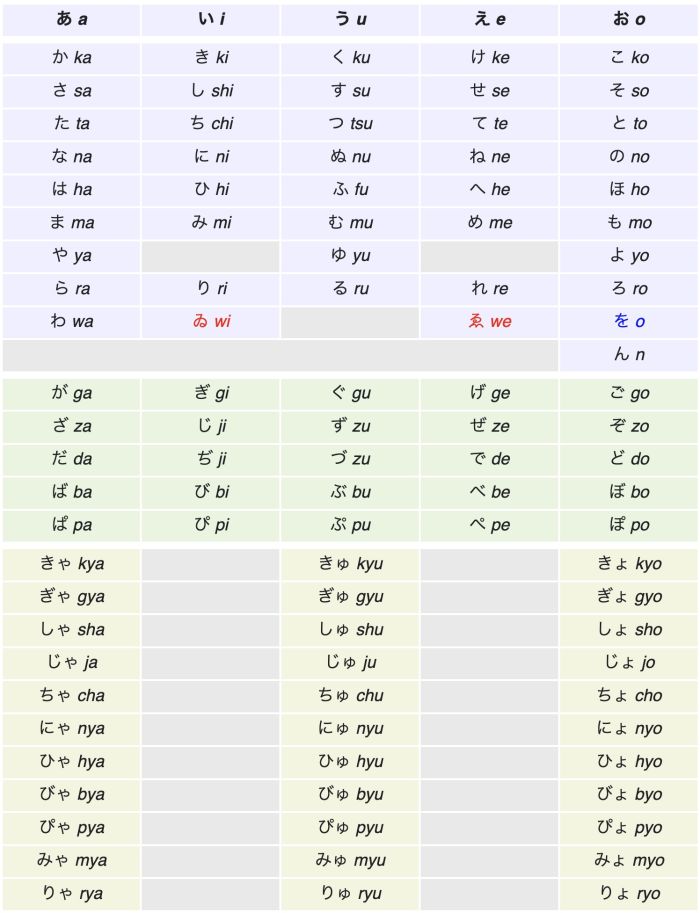 Le tableau ci-dessous (source : Wikipédia) liste le syllabaire hiragana. Les caractères en rouge sont désormais obsolètes, le caractère en bleu est rarement utilisé en japonais moderne en dehors de son statut de particule grammaticale.